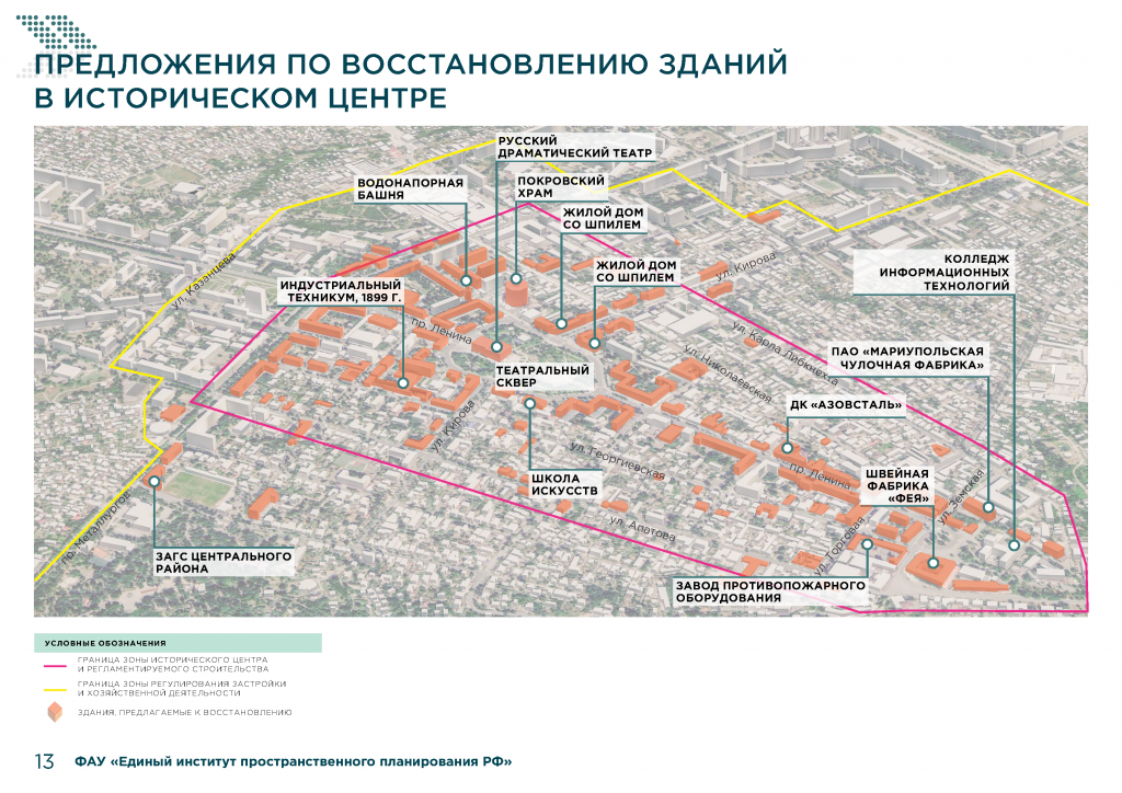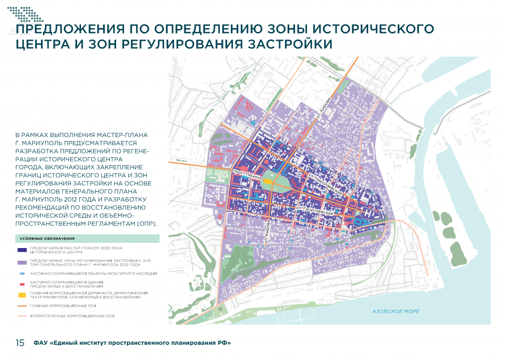 В рамках выполнения мастер-плана г. мариуполь предусматривается разработка предложений по регенерации исторического центра города, включающих закрепление границ исторического центра и зон регулирования застройки на основе материалов генерального плана г. мариуполь 2012 года и разработку рекомендаций по восстановлению исторической среды и объемно- пространственным регламентам (опр).